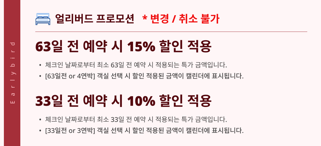 | [üũÀÎ 14:00 / üũ¾Æ¿ô 12:00] ¡Úº¯°æ, Ãë¼Ò ±ÔÁ¤ ¾È³»¡Ú ¤ý¸ðµç È£ÅÚ ¿¹¾àÀÇ Ãë¼Ò ¹× º¯°æÀº º£Æ®³²½ºÅ丮¸¦ ÅëÇØ¼¸¸ ÀÌ·ç¾îÁ®¾ß ÇÏ¸ç ±Ù¹«½Ã°£¿Ü¿¡ Á¢¼öµÈ °Ç¿¡ ´ëÇØ¼´Â ¡¡´ÙÀ½ ±Ù¹« ÀÏÀÚ¿¡ Á¢¼öµÈ °ÍÀ¸·Î °£Áֵǰí 󸮵˴ϴÙ. (»ó´ã°Ô½ÃÆÇ ÀÌ¿ë) ¤ýÃë¼Ò´Â °¢ È£ÅÚ ±ÔÁ¤À» µû¸£¸ç Á¤È®ÇÑ Ãë¼Ò ÀÏÀÚ ¹× ÆÐ³ÎƼ´Â °´½ÇÀÌ È®Á¤µÇ¾úÀ» ¶§ ¾Ë ¼ö ÀÖ½À´Ï´Ù. ¤ý¿¹¾à ½Ã ¹Ì¸® ÆÐ³ÎƼ¸¦ ¾È³»Çصå·È¾îµµ, ÇöÁö »çÁ¤/Çà»ç µî¿¡ ÀÇÇØ ÆÐ³ÎƼ ±ÔÁ¤ÀÌ º¯µ¿µÉ ¼ö ÀÖÀ¸´Ï ¾çÇØ ºÎʵ右´Ï´Ù. ¡Ú ¾ó¸®¹öµå Àû¿ë ¿¹¾à °ÇÀÇ °æ¿ì, º¯°æ ¹× Ãë¼Ò ºÒ°¡ ¡Ú ¡ß LOW & HIGH SEASON : üũÀÎ 30ÀÏ Àü ¹«·á º¯°æ,Ãë¼Ò 2025³â : 2¿ù8ÀÏ - 12¿ù25ÀÏ 2026³â : 1¿ù6ÀÏ - 2¿ù16ÀÏ, 2¿ù23ÀÏ - 12¿ù25ÀÏ ¡ß PEAK SEASON(3¹Ú Çʼö) : üũÀÎ 55ÀÏ Àü ¹«·á º¯°æ,Ãë¼Ò 2025³â : 12¿ù26ÀÏ - 31ÀÏ 2026³â : 1¿ù1ÀÏ - 1¿ù5ÀÏ, 2¿ù17ÀÏ - 2¿ù22ÀÏ / 12¿ù26ÀÏ - 12¿ù31ÀÏ ¡Ø ¹«·á º¯°æ, Ãë¼Ò ±â°£ ÀÌÈķδ ¸ðµç º¯°æ ¹× Ãë¼Ò°¡ ºÒ°¡ÇÕ´Ï´Ù. ¡Ø Ãë¼Ò º¯°æ ºÒ°¡ ÇÁ·Î¸ð¼ÇÀÌ Àû¿ëµÇ¾úÀ» °æ¿ì ºÒ°¡´ÉÇÕ´Ï´Ù. ¡Ø ÈÞÀÏ ¹× ÆòÀÏ »ç¹«½Ç ¾÷¹«Á¾·á ÈÄ Ãë¼Ò´Â Ãâ¹ßÀÏ ±âÁØ¿¡¼ Á¦¿ÜµË´Ï´Ù. [¿¹¾à ½Ã À¯ÀÇ»çÇ×] 1. ¿¹¾à ¿äû ¤ý¼¼±Ý ¹× ºÀ»ç·á Æ÷ÇÔÇÑ ÃÑ °áÁ¦ ±Ý¾×ÀÔ´Ï´Ù. ¤ýÁ¶½Ä ºÒÆ÷ÇÔ À̶ó´Â º°µµ Ç¥½Ã°¡ ¾ø´Â ÇÑ ¸ðµç °´½ÇÀº °´½Ç ´ç ±âÁØÀοø¿¡ ´ëÇÑ Á¶½Ä Æ÷ÇÔ ¿ä±ÝÀÔ´Ï´Ù. ¤ýµ¿ÀÏÇÑ À̸§À¸·Î °°Àº ³¯Â¥¿¡ ¿©·¯ È£ÅÚ¿¡ ¿¹¾àÀ» ³Ö´Â °æ¿ì ¿¹¾à È¥¼±ÀÌ ¾ß±âµÉ ¼ö ÀÖ½À´Ï´Ù. ¤ý¼÷¹Ú½Ã¼³ÀÌ ±ÔÁ¤ÇÏ´Â ±ÔÄ¢°ú ¾à°üÀ» ÁؼöÇØ¾ß ÇÕ´Ï´Ù. ¤ýº£µåŸÀÔÀº È®Á¤»çÇ×ÀÌ ¾Æ´Õ´Ï´Ù. 2. ¿¹¾à È®Á¤ ¤ýÈ£ÅÚ ¿¹¾à ÈÄ ¿µ¾÷ÀÏ ±âÁØ 24½Ã°£ À̳» ¹®ÀÚ·Î °´½Ç È®Á¤ ¿©ºÎ¸¦ ¾Ë·Áµå¸³´Ï´Ù. ¤ýº£Æ®³² ½ºÅ丮´Â Ư°¡°´½Ç ¿î¿µÀ» À§ÇØ È£ÅÚ È¤Àº ÇØ¿Ü ¿¡ÀÌÀü½Ã¿Í Á÷°Å·¡¸¦ Çϱ⠶§¹®¿¡ ¿©Çà»ç °ø½Ä °èÁ ¼Û±Ý¸¸ °¡´ÉÇÕ´Ï´Ù. ¾çÇØ¹Ù¶ø´Ï´Ù. ¡¡°´½Ç È®Á¤ °íÁö ÈÄ °áÁ¦½ÃÇÑ À̳» °áÁ¦°¡ ÀÌ·ç¾îÁöÁö ¾ÊÀ¸¸é ¿¹¾àÀº °íÁö ¾øÀÌ ÀÚµ¿ Ãë¼ÒµË´Ï´Ù. ¤ý°áÁ¦´Â ¿©Çà»ç °ø½Ä °èÁ·ΠȣÅÚ ¿¹¾àÀÚ ¸íÀÇ·Î ¼Û±Ý ÇØÁÖ¼Å¾ß ÇÕ´Ï´Ù. ŸÀÎ ¸íÀÇ·Î ¼Û±Ý ½Ã ÀüÈ ¹®Àǹٶø´Ï´Ù. 3. ¿¹¾àÈ®Á¤¼(¹Ù¿ìó) ¹ß±Þ ¤ýº£Æ®³²½ºÅ丮 È£ÅÚ ¿¹¾àÁ¶°ÇÀº °´½Ç È®Á¤ ÈÄ ¹Ýµå½Ã Ãâ¹ß Àü °´½Ç·á¸¦ ÁöºÒÇØ¾ß ÇÏ´Â "¼± ÁöºÒ¹æ½Ä"À̸ç, ¡¡°áÁ¦¿Ï·á ÈÄ ¹Ýµå½Ã ¼÷¹Ú±Ç(¹Ù¿ìó)¸¦ Ãâ·ÂÇϼż üũÀÎ ½Ã ÇÁ·ÐÆ®¿¡ Á¦½ÃÇØ¾ßÇÕ´Ï´Ù. ¡¡¼÷¹Ú±ÇÀº ÃÖ´ë ¿µ¾÷ÀÏ ±âÁØ 5ÀÏ À̳» ¸ÞÀÏ·Î ¹ß¼ÛÇØµå¸³´Ï´Ù. 4. ¿¹¾à Ãë¼Ò ¹× No-show ¤ýº£Æ®³²½ºÅ丮´Â °í°´´ÔÀÇ No-show ¹× Go-show ¿¡ ´ëÇØ ÀÏüÀÇ Ã¥ÀÓÀ» ÁöÁö ¾Ê»ç¿À´Ï, »çÀü¿¡ ¿¹¾àÈ®Á¤ ¹× ¡¡½ÇÁ¦ Åõ¼÷ ¿©ºÎ¸¦ Á¤È®ÇÏ°Ô È®ÀÎÇϼż ÇöÁö¿¡¼ ºÒÀÌÀÍÀ» ´çÇÏÁö ¾Êµµ·Ï ÁÖÀÇÇϽñ⠹ٶø´Ï´Ù. ¡¡No-show : ¿¹¾àÈ®Á¤À» ¹ÞÀº µÚ ¿¹¾àµÈ ³¯Â¥¿¡ °í°´ÀÌ È£ÅÚ¿¡ Åõ¼÷ÇÏÁö ¾Ê´Â °æ¿ì(¿¹¾àºÎµµ) ¡¡Go-show : ¿¹¾à¸¸ ÇÏ°í ¿¹¾àÈ®Á¤À» ¹ÞÁö ¸øÇÑ »óÅ¿¡¼ È£ÅÚ Åõ¼÷À» À§ÇØ ÇöÁöÈ£ÅÚ¿¡¼ ´ë±âÇÏ´Â °æ¿ì ¤ýÀ¥»çÀÌÆ®ÀÇ È£ÅÚÁ¤º¸´Â È£ÅÚ¿¹¾àÀ» À§ÇÑ Âü°í ÀÚ·á·Î È£ÅÚ ³» ÀÚü º¯µ¿À̳ª ±âŸ »çÀ¯·Î ½ÇÁ¦¿Í Â÷À̰¡ ÀÖÀ» ¼ö ÀÖÀ¸¸ç, ¡¡ÀÌ¿¡ ´ëÇØ º£Æ®³²½ºÅ丮´Â Ã¥ÀÓÀ» ÁöÁö ¾ÊÀ½À» ¾çÁöÇϽñ⠹ٶø´Ï´Ù. ¤ý°´½Ç¹èÁ¤¿¡ µû¸¥ ¿äû»çÇ×(±Ý¿¬·ë, °íÃþ µî)Àº È£ÅÚ¿¡ Àü´ÞµÇ³ª, ½ÇÁ¦ ¿î¿µÇϴ ȣÅÚÀÇ »çÁ¤¿¡ µû¶ó °áÁ¤µÇ´Â »ç¾ÈÀ¸·Î ¡¡º£Æ®³²½ºÅ丮¿¡¼ º¸Àå ÇÒ ¼ö ÀÖ´Â »çÇ×ÀÌ ¾Æ´ÔÀ» ¾Ë·Áµå¸³´Ï´Ù. ¤ýÀüü Åõ¼÷°´¼ö°¡ ÃÖ´ë ¼ö¿ëÀοøÀ» ÃʰúÇØ¼´Â ¾È µÇ¸ç, ¸¸¾à ±ÔÁ¤À» ¾î±â¸é µµÂø ½Ã ¡¡¼÷¹ÚÀ» °ÅÀý´çÇϰųª Ãß°¡¿ä±ÝÀ» ³»¾ß ÇÒ ¼öµµ ÀÖ½À´Ï´Ù. ¤ýÃë¼Ò¸¶°¨ÀÏ »êÁ¤Àº Åä¿äÀÏ, ÀÏ¿äÀÏ, °øÈÞÀÏÀ» Á¦¿ÜÇϰí, °æ¿ì¿¡ µû¶ó º°µµÀÇ Ãë¼Ò¸¶°¨ÀÏÀÌ ¡¡Àû¿ëµÉ ¼ö ÀÖ½À´Ï´Ù. (Çà»ç ȤÀº È£ÅÚ ÃøÀÇ Æ¯º°±ÔÁ¤À» µû¸¨´Ï´Ù) |
