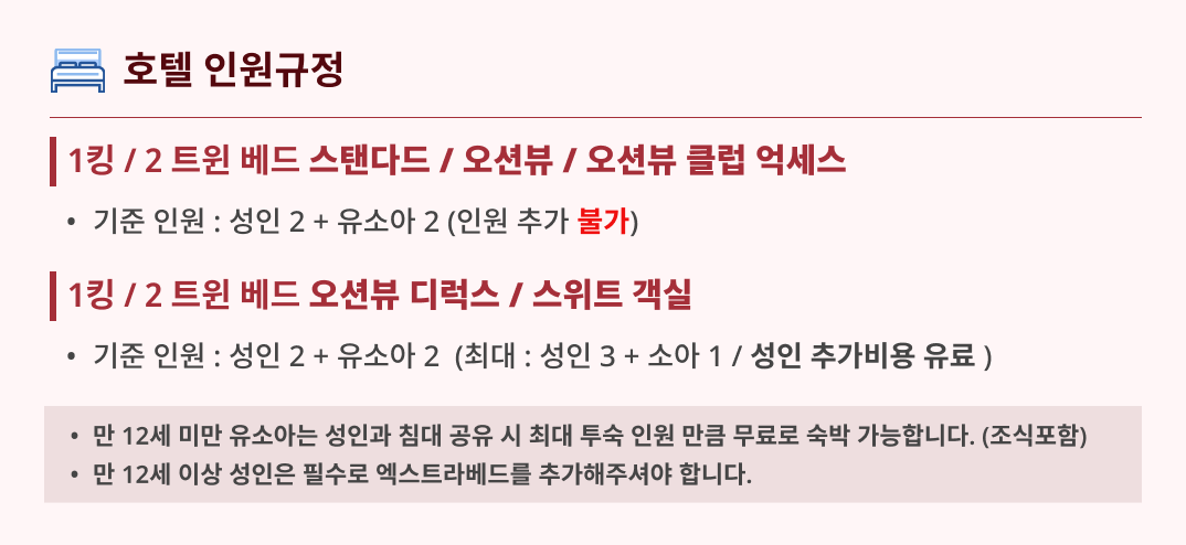 | [üũÀÎ 15:00 / üũ¾Æ¿ô 12:00] ¡Úº¯°æ, Ãë¼Ò ±ÔÁ¤ ¾È³»¡Ú ** ¸ðµç ¿¹¾à ȯºÒ, º¯°æ Àý´ë ºÒ°¡ÇÕ´Ï´Ù. ** ¤ý¸ðµç È£ÅÚ ¿¹¾àÀÇ Ãë¼Ò ¹× º¯°æÀº º£Æ®³²½ºÅ丮¸¦ ÅëÇØ¼¸¸ ÀÌ·ç¾îÁ®¾ß ÇÏ¸ç ±Ù¹«½Ã°£¿Ü¿¡ Á¢¼öµÈ °Ç¿¡ ´ëÇØ¼´Â ¡¡´ÙÀ½ ±Ù¹« ÀÏÀÚ¿¡ Á¢¼öµÈ °ÍÀ¸·Î °£Áֵǰí 󸮵˴ϴÙ. (»ó´ã°Ô½ÃÆÇ ÀÌ¿ë) ¤ýÃë¼Ò´Â °¢ È£ÅÚ ±ÔÁ¤À» µû¸£¸ç Á¤È®ÇÑ Ãë¼Ò ÀÏÀÚ ¹× ÆÐ³ÎƼ´Â °´½ÇÀÌ È®Á¤µÇ¾úÀ» ¶§ ¾Ë ¼ö ÀÖ½À´Ï´Ù. ¤ý¿¹¾à ½Ã ¹Ì¸® ÆÐ³ÎƼ¸¦ ¾È³»Çصå·È¾îµµ, ÇöÁö »çÁ¤/Çà»ç µî¿¡ ÀÇÇØ ÆÐ³ÎƼ ±ÔÁ¤ÀÌ º¯µ¿µÉ ¼ö ÀÖÀ¸´Ï ¾çÇØ ºÎʵ右´Ï´Ù. ¡Ø ¹«·á º¯°æ, Ãë¼Ò ±â°£ ÀÌÈķδ ¸ðµç º¯°æ ¹× Ãë¼Ò°¡ ºÒ°¡ÇÕ´Ï´Ù. ¡Ø Ãë¼Ò º¯°æ ºÒ°¡ ÇÁ·Î¸ð¼ÇÀÌ Àû¿ëµÇ¾úÀ» °æ¿ì ºÒ°¡´ÉÇÕ´Ï´Ù. ¡Ø ÈÞÀÏ ¹× ÆòÀÏ »ç¹«½Ç ¾÷¹«Á¾·á ÈÄ Ãë¼Ò´Â Ãâ¹ßÀÏ ±âÁØ¿¡¼ Á¦¿ÜµË´Ï´Ù. [¿¹¾à ½Ã À¯ÀÇ»çÇ×] 1. ¿¹¾à ¿äû ¤ý¼¼±Ý ¹× ºÀ»ç·á Æ÷ÇÔÇÑ ÃÑ °áÁ¦ ±Ý¾×ÀÔ´Ï´Ù. ¤ýÁ¶½Ä ºÒÆ÷ÇÔ À̶ó´Â º°µµ Ç¥½Ã°¡ ¾ø´Â ÇÑ ¸ðµç °´½ÇÀº °´½Ç ´ç ±âÁØÀοø¿¡ ´ëÇÑ Á¶½Ä Æ÷ÇÔ ¿ä±ÝÀÔ´Ï´Ù. ¤ýµ¿ÀÏÇÑ À̸§À¸·Î °°Àº ³¯Â¥¿¡ ¿©·¯ È£ÅÚ¿¡ ¿¹¾àÀ» ³Ö´Â °æ¿ì ¿¹¾à È¥¼±ÀÌ ¾ß±âµÉ ¼ö ÀÖ½À´Ï´Ù. ¤ý¼÷¹Ú½Ã¼³ÀÌ ±ÔÁ¤ÇÏ´Â ±ÔÄ¢°ú ¾à°üÀ» ÁؼöÇØ¾ß ÇÕ´Ï´Ù. ¤ýº£µåŸÀÔÀº È®Á¤»çÇ×ÀÌ ¾Æ´Õ´Ï´Ù. 2. ¿¹¾à È®Á¤ ¤ýÈ£ÅÚ ¿¹¾à ÈÄ ¿µ¾÷ÀÏ ±âÁØ 24½Ã°£ À̳» ¹®ÀÚ·Î °´½Ç È®Á¤ ¿©ºÎ¸¦ ¾Ë·Áµå¸³´Ï´Ù. ¤ýº£Æ®³² ½ºÅ丮´Â Ư°¡°´½Ç ¿î¿µÀ» À§ÇØ È£ÅÚ È¤Àº ÇØ¿Ü ¿¡ÀÌÀü½Ã¿Í Á÷°Å·¡¸¦ Çϱ⠶§¹®¿¡ ¿©Çà»ç °ø½Ä °èÁ ¼Û±Ý ¹æ½ÄÀ¸·Î °¡´ÉÇϸç, ÀϺΠ°í°¡È£ÅÚ¸¸ Ä«µå°áÁ¦°¡ °¡´ÉÇÕ´Ï´Ù. ¡¡°´½Ç È®Á¤ °íÁö ÈÄ °áÁ¦½ÃÇÑ À̳» °áÁ¦°¡ ÀÌ·ç¾îÁöÁö ¾ÊÀ¸¸é ¿¹¾àÀº °íÁö ¾øÀÌ ÀÚµ¿ Ãë¼ÒµË´Ï´Ù. ¤ý°áÁ¦´Â ¿©Çà»ç °ø½Ä °èÁ·ΠȣÅÚ ¿¹¾àÀÚ ¸íÀÇ·Î ¼Û±Ý ÇØÁÖ¼Å¾ß ÇÕ´Ï´Ù. ŸÀÎ ¸íÀÇ·Î ¼Û±Ý ½Ã ÀüÈ ¹®Àǹٶø´Ï´Ù. 3. ¿¹¾àÈ®Á¤¼(¹Ù¿ìó) ¹ß±Þ ¤ýº£Æ®³²½ºÅ丮 È£ÅÚ ¿¹¾àÁ¶°ÇÀº °´½Ç È®Á¤ ÈÄ ¹Ýµå½Ã Ãâ¹ß Àü °´½Ç·á¸¦ ÁöºÒÇØ¾ß ÇÏ´Â "¼± ÁöºÒ¹æ½Ä"À̸ç, ¡¡°áÁ¦¿Ï·á ÈÄ ¹Ýµå½Ã ¼÷¹Ú±Ç(¹Ù¿ìó)¸¦ Ãâ·ÂÇϼż üũÀÎ ½Ã ÇÁ·ÐÆ®¿¡ Á¦½ÃÇØ¾ßÇÕ´Ï´Ù. ¡¡¼÷¹Ú±ÇÀº ÃÖ´ë ¿µ¾÷ÀÏ ±âÁØ 5ÀÏ À̳» ¸ÞÀÏ·Î ¹ß¼ÛÇØµå¸³´Ï´Ù. 4. ¿¹¾à Ãë¼Ò ¹× No-show ¤ýº£Æ®³²½ºÅ丮´Â °í°´´ÔÀÇ No-show ¹× Go-show ¿¡ ´ëÇØ ÀÏüÀÇ Ã¥ÀÓÀ» ÁöÁö ¾Ê»ç¿À´Ï, »çÀü¿¡ ¿¹¾àÈ®Á¤ ¹× ¡¡½ÇÁ¦ Åõ¼÷ ¿©ºÎ¸¦ Á¤È®ÇÏ°Ô È®ÀÎÇϼż ÇöÁö¿¡¼ ºÒÀÌÀÍÀ» ´çÇÏÁö ¾Êµµ·Ï ÁÖÀÇÇϽñ⠹ٶø´Ï´Ù. ¡¡No-show : ¿¹¾àÈ®Á¤À» ¹ÞÀº µÚ ¿¹¾àµÈ ³¯Â¥¿¡ °í°´ÀÌ È£ÅÚ¿¡ Åõ¼÷ÇÏÁö ¾Ê´Â °æ¿ì(¿¹¾àºÎµµ) ¡¡Go-show : ¿¹¾à¸¸ ÇÏ°í ¿¹¾àÈ®Á¤À» ¹ÞÁö ¸øÇÑ »óÅ¿¡¼ È£ÅÚ Åõ¼÷À» À§ÇØ ÇöÁöÈ£ÅÚ¿¡¼ ´ë±âÇÏ´Â °æ¿ì ¤ýÀ¥»çÀÌÆ®ÀÇ È£ÅÚÁ¤º¸´Â È£ÅÚ¿¹¾àÀ» À§ÇÑ Âü°í ÀÚ·á·Î È£ÅÚ ³» ÀÚü º¯µ¿À̳ª ±âŸ »çÀ¯·Î ½ÇÁ¦¿Í Â÷À̰¡ ÀÖÀ» ¼ö ÀÖÀ¸¸ç, ¡¡ÀÌ¿¡ ´ëÇØ º£Æ®³²½ºÅ丮´Â Ã¥ÀÓÀ» ÁöÁö ¾ÊÀ½À» ¾çÁöÇϽñ⠹ٶø´Ï´Ù. ¤ý°´½Ç¹èÁ¤¿¡ µû¸¥ ¿äû»çÇ×(±Ý¿¬·ë, °íÃþ µî)Àº È£ÅÚ¿¡ Àü´ÞµÇ³ª, ½ÇÁ¦ ¿î¿µÇϴ ȣÅÚÀÇ »çÁ¤¿¡ µû¶ó °áÁ¤µÇ´Â »ç¾ÈÀ¸·Î ¡¡º£Æ®³²½ºÅ丮¿¡¼ º¸Àå ÇÒ ¼ö ÀÖ´Â »çÇ×ÀÌ ¾Æ´ÔÀ» ¾Ë·Áµå¸³´Ï´Ù. ¤ýÀüü Åõ¼÷°´¼ö°¡ ÃÖ´ë ¼ö¿ëÀοøÀ» ÃʰúÇØ¼´Â ¾È µÇ¸ç, ¸¸¾à ±ÔÁ¤À» ¾î±â¸é µµÂø ½Ã ¡¡¼÷¹ÚÀ» °ÅÀý´çÇϰųª Ãß°¡¿ä±ÝÀ» ³»¾ß ÇÒ ¼öµµ ÀÖ½À´Ï´Ù. ¤ýÃë¼Ò¸¶°¨ÀÏ »êÁ¤Àº Åä¿äÀÏ, ÀÏ¿äÀÏ, °øÈÞÀÏÀ» Á¦¿ÜÇϰí, °æ¿ì¿¡ µû¶ó º°µµÀÇ Ãë¼Ò¸¶°¨ÀÏÀÌ ¡¡Àû¿ëµÉ ¼ö ÀÖ½À´Ï´Ù. (Çà»ç ȤÀº È£ÅÚ ÃøÀÇ Æ¯º°±ÔÁ¤À» µû¸¨´Ï´Ù) |
