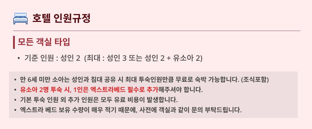 1. ¿¹¾à ¿äû ¤ý¼¼±Ý ¹× ºÀ»ç·á Æ÷ÇÔÇÑ ÃÑ °áÁ¦ ±Ý¾×ÀÔ´Ï´Ù. ¤ýÁ¶½Ä ºÒÆ÷ÇÔ À̶ó´Â º°µµ Ç¥½Ã°¡ ¾ø´Â ÇÑ ¸ðµç °´½ÇÀº °´½Ç ´ç ±âÁØÀοø¿¡ ´ëÇÑ Á¶½Ä Æ÷ÇÔ ¿ä±ÝÀÔ´Ï´Ù. ¤ýµ¿ÀÏÇÑ À̸§À¸·Î °°Àº ³¯Â¥¿¡ ¿©·¯ È£ÅÚ¿¡ ¿¹¾àÀ» ³Ö´Â °æ¿ì ¿¹¾à È¥¼±ÀÌ ¾ß±âµÉ ¼ö ÀÖ½À´Ï´Ù. ¤ý¼÷¹Ú½Ã¼³ÀÌ ±ÔÁ¤ÇÏ´Â ±ÔÄ¢°ú ¾à°üÀ» ÁؼöÇØ¾ß ÇÕ´Ï´Ù. ¤ýº£µåŸÀÔÀº È®Á¤»çÇ×ÀÌ ¾Æ´Õ´Ï´Ù.